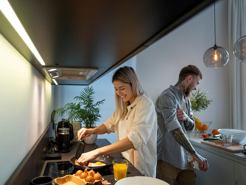 This custom kitchen design features a sleek and modern aesthetic, incorporating high-quality stainless steel appliances and fixtures.